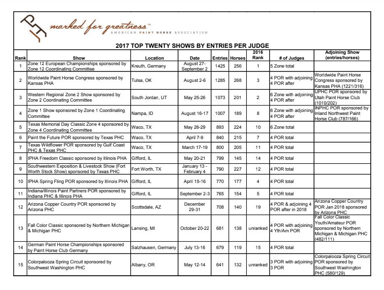 Damit ist die Paint Horse-Europameisterschaft auch deutlich größer als die Quarter Horse-Europameisterschaft, die 994 AQHA-Starts je Richter verzeichnet.