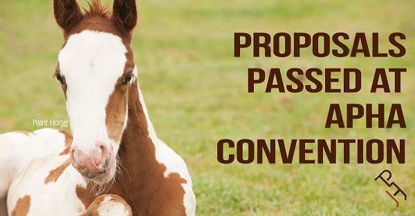 SUMMARY: Amends the current RG-070.E to require a minimum of one APHA-registered parent (with the other parent being APHA, AQHA or Jockey Club) in a horse’s effort to earn Regular Registry status, provided the horse possesses at least one Paint trait and APHA genetic testing proves the horse carries at least one Paint pattern gene.