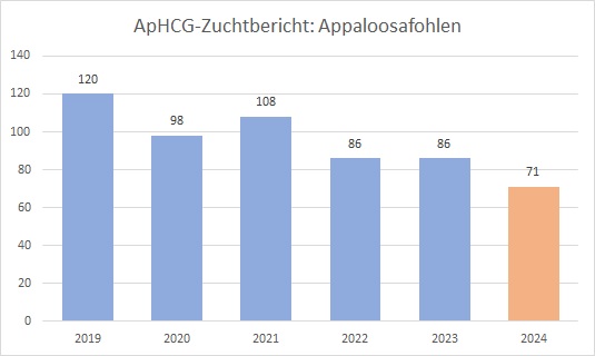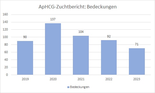 Der ApHCG meldet in seinem Zuchtbericht 2023 86 Appaloosafohlen, womit sich der Abwärtstrend der letzten Jahre fortsetzt (siehe hier). Mit 71 Bedeckungen für die Zuchtsaison 2023 wird sich dieser Trend auch in diesem Jahr fortsetzen.