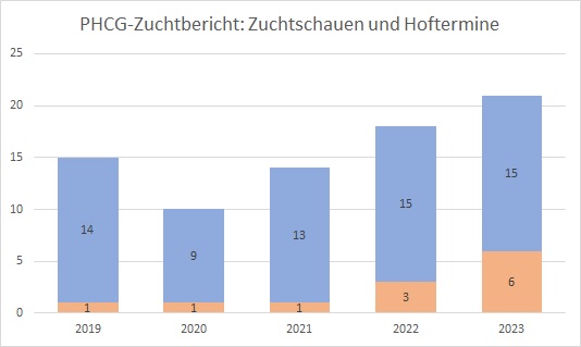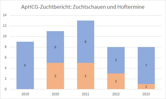 Dementsprechend niedrig liegt die Zahl der Zuchtschauen und Hoftermine, im Zuchtjahr 2023 fanden insgesamt sieben ApHCG-Zuchtschauen und ein Hoftermin in Deutschland statt, 2020 waren es noch acht ApHCG-Zuchtschauen und fünf Hoftermine.