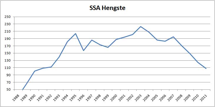 Mit derzeit 108 einbezahlten SSA-Hengsten (Stand: 28.09.11) stehen so wenig Hengste wie seit zwanzig Jahren nicht mehr zur Auswahl (1991: 109 Hengste).