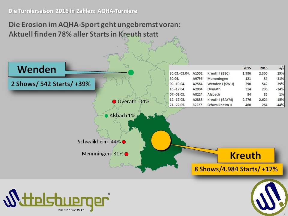 Damit ist für die AQHA-Turnierreiter ist in dieser Saison laufend German Open: 78% aller Starts der 14 Turniere mit 21 AQHA-Shows fanden in Kreuth statt, auf der Bavarian Spring Classic und Bayr. Meisterschaft, beides Vierfach-Shows.