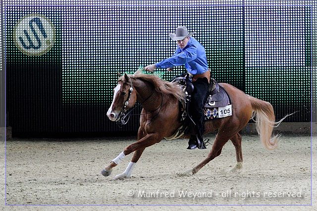 Der vielfache Bronze Trophy Champion Daniel Klein reitet mit dem Hengst Glueckskeks das einzige Paint Horse im Starterfeld. Mit ihm wurde Klein 2012 NRHA NRW Open Res. Champion und Achter beim NRHA Breeders Derby.