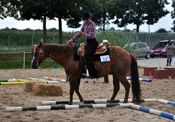 Am 23. Juli war es soweit: Startschuss zum KRÄMER TRAIL CUP 2011 in Neukirchen–Vluyn. Bundesweit reiten die Teilnehmer im MEGA STORE in ihrer Region um den Einzug ins Finale in Florstadt. Hier erwartet den Gewinner jeder Klasse ein Jürgen Pieper Reiningsattel im Wert von 2.859,00 €. In Neukirchen Vluyn zeigte sich bereits wie attraktiv dieser Cup für Reiter und Zuschauer ist. Es waren 20 Pferde (Einsteiger- und Amtateurklasse) genannt und diese hatten einen anspruchsvollen Trailparcours zu bewältigen. Mit platzbedingt wenig Galopp ,aber jeder Menge Stangenarbeit im Schritt und Trab verlangte dieser Parcours von den Reitern und vor allen den Pferden viel Konzentration. Die Reiter waren von der Zusammenstellung der Hindernisse angenehm überrascht. Trotz des kleinen Platz war der Parcours flüssig und anspruchsvoll. Die begeisterten Zuschauer bekamen tolle Ritte zu sehen und auch EWU Richter Jochen Held war vom Standard der Reiter überzeugt.